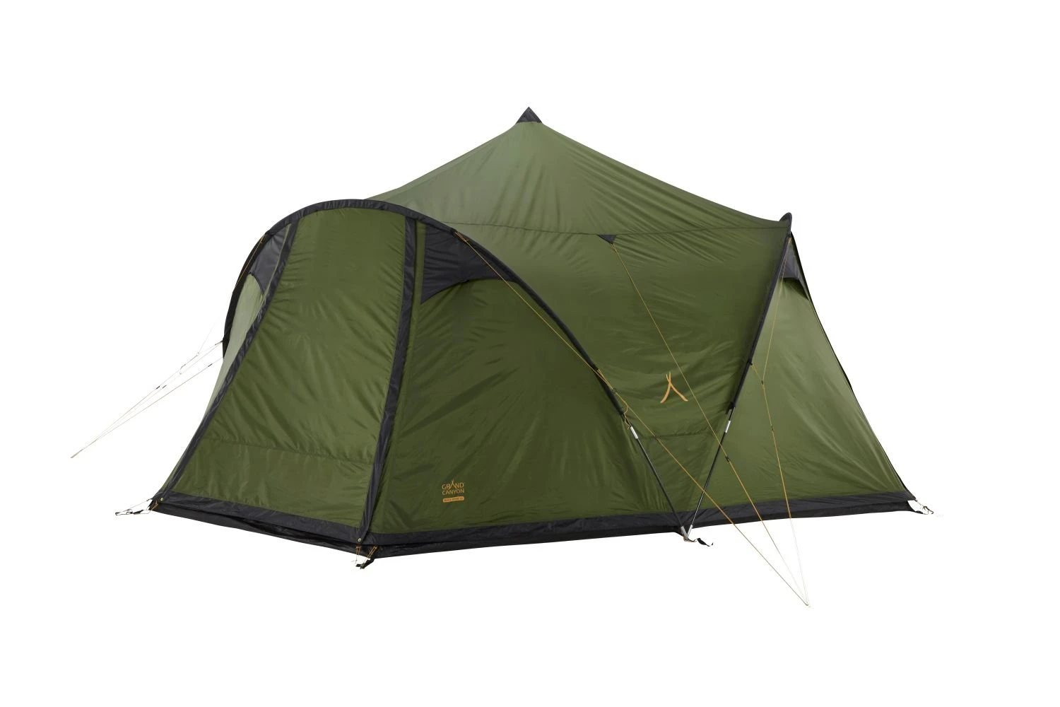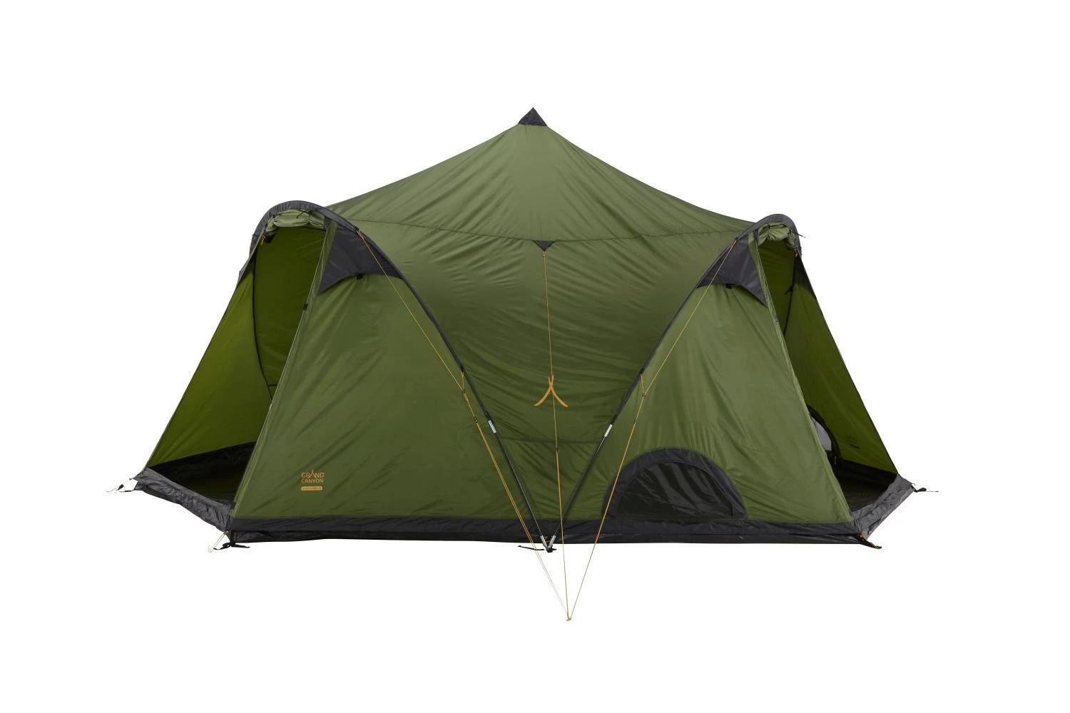 Mit BLACK KNOB 10 interpretiert GRAND CANYON Gruppenzelte im Tipi-Stil neu. Die gerade Tipi-Stange in der Mitte wird ergänzt durch drei identische Gestängebögen, die drei identische Eingänge bilden. Im gesamten Hauptteil des Zeltes kann man stehen. Die großen Eingänge sind vielseitig nutzbar und können gleichzeitig geöffnet werden, um das Zelt tagsüber als Schutz vor der Sonne zu nutzen. Das Zelt bietet viel Platz für bis zu 10 Personen. Moskitonetze lassen Luft und Licht herein und sorgen zusätzlich für ein großes Raumgefühl im Zelt. BLACK KNOB 10 sorgt für Gruppencamping auf einem neuen Niveau.