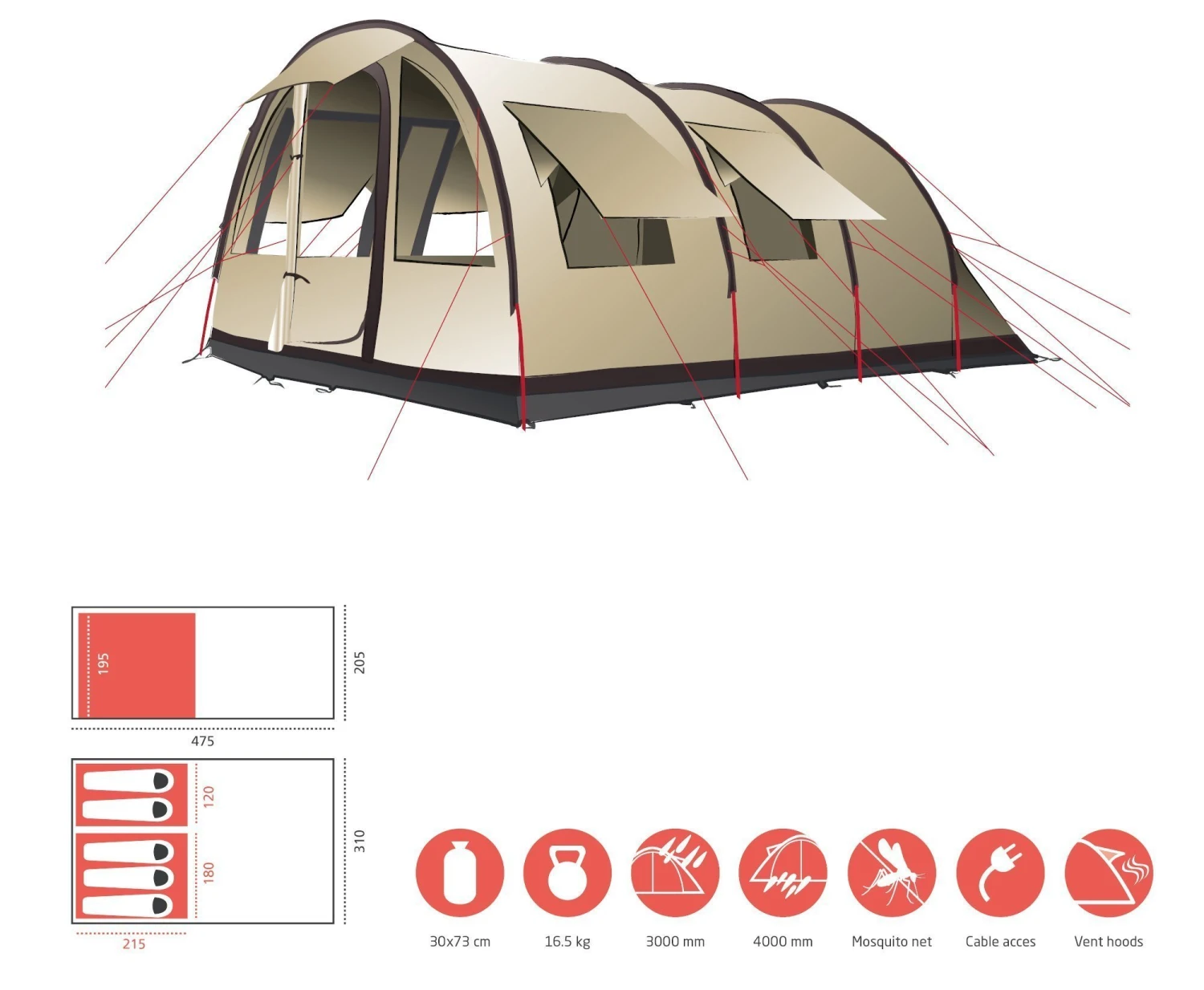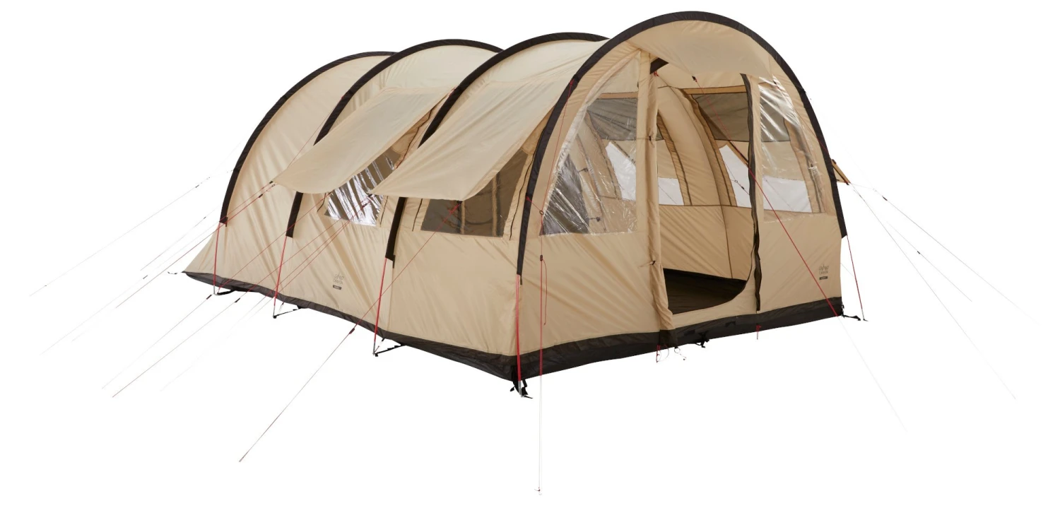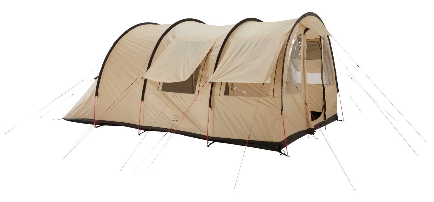 Das Grand Canyon Helena 5-Personen Zelt ist ein Tunnelzelt für Familien und Gruppen mit einem hervorragenden Raumgefühl und zwei separaten Schlafbereichen – ein Bereich für drei Personen und der andere für zwei Personen oder Gepäck und Ausrüstung. Die große Apsis ist durchgängig über 2 Meter hoch und bietet Platz zum gemütlichen Zusammensitzen am Tag oder beim Abendessen. Große abgedeckte Belüftungsöffnungen und Fenster mit Moskitonetzen auf der Außenplane für eine angenehme Luftzirkulation und ein gutes Raumklima im Zelt.