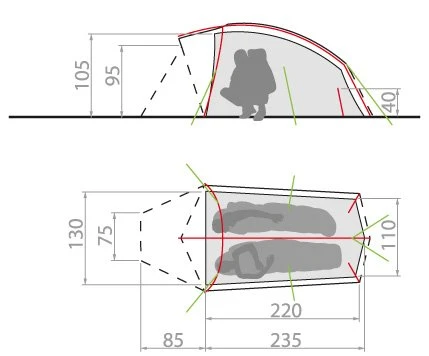 • optimierte Raumausnützung durch abgewinkeltes Gestänge im Fußbereich und zusätzlichen Pins im Außenzelt